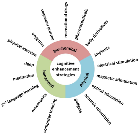 Uma estratégia bastante comum é o emprego de substâncias de uso recreacional, como a nicotina - que melhora a atenção e a memória, e inclusive o álcool, como um melhorador da criatividade. Mas o coração dos nootrópicos farmacológicos está nos estimulantes de origem sintética, como a anfetamina, o metilfenidato, o modafinil, a memantina e os inibidores da acetilcolinesterase (ex.: rivastigmina).